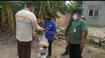 Dalam acara tersebut Babinsa Lubuk Gaung, Serka Eko Saprianto secara simbolik memasangkan masker pada salah seorang warga penerima bantuan sembako dan masker.
