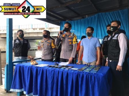 Kepala Kepolisian Resor (Kapolres) Dumai AKBP Andri Ananta Yudhistira, S.I.K, M.H Didampingi Wakapolres Dumai KOMPOL Alex Sandy Siregar, S.I.K, M.H, Kasat Reskrim Polres Dumai AKP DHANI ANDIKA KARYA GITA, S.I.K, M.H Dan Kasat Pol Air Polres Dumai AKP I Komang Aswatama, S.H, S.I.K Kepada Rekan Media Pada Pelaksanaan Press Conference, Sabtu (13/06/2020) Bertempat Di Mako Sat Pol Air Polres Dumai Menjelaskan, Ketiga Tersangka Kasus Dugaan Penyelundupan Orang Tersebut Yakni YS (68), ZE (37) Dan MB (34).