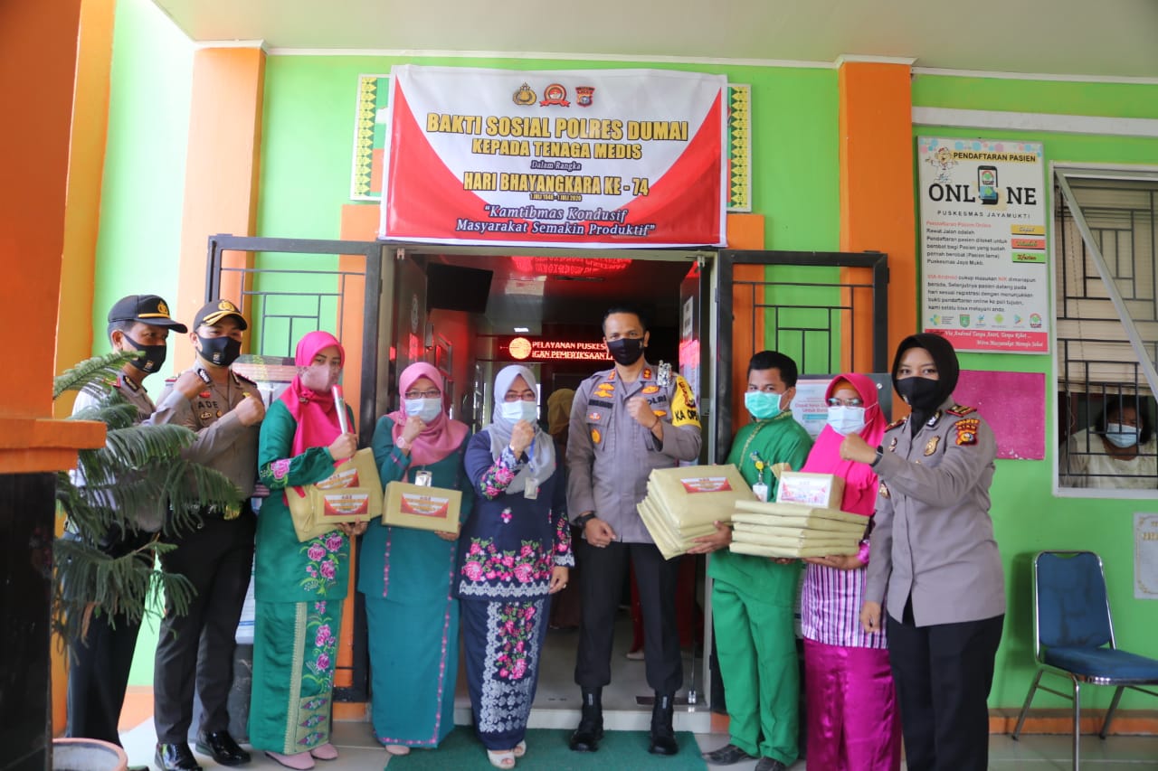 DUMAI ( sumut24.net ) - Dalam rangka memperingati Hari Bhayangkara Ke - 74 Tahun 2020, Polres Dumai menggelar Bakti Sosial kepada tenaga medis di Puskesmas Jaya Mukti, Jumat (18/06/2020).