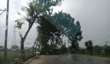 Satu batang pohon mahoni yang ambruk tepat di depan Citi mall dan pohon satunya di depan jalan Beringin Patra sebelum pintu masuk ke Pos Skurity Komplek Pertamina RU II Dumai.