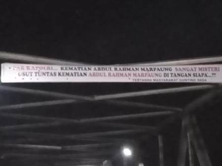 Menuntut keadilan warga Kelurahan Gunting Saga dan keluarga menaikkan spanduk sekira pukul 21.00 wib 01/10/2020 yang bertuliskan " PAK KAPOLRI KEMATIAN ABDUL RAMAN MARPAUNG SANGAT MISTERI, USUT TUNTAS KEMTIAN ABDUL RAHMAN DI TANGAN SIAPA....?? Terpasang di tiga titik lokasi, di atas jembatan Gunting Saga dua spanduk dan satunya terpasang di jalan lintas Sumatra Desa Si Dua-dua (sawah lebar), namun sangat di sayangkan spanduk yang sudah terpasang hilang dan dirusak oleh oknum yang tidak bertanggung jawab.