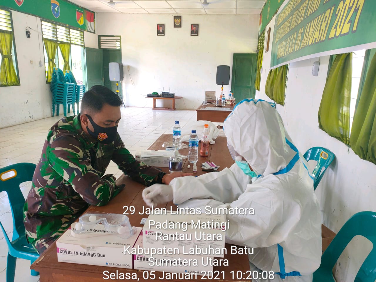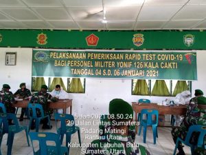 Rantauprapat ( sumut24.net ) - Atas instruksi Danyonif 126/KC Mayor Inf Dwi Widodo, S.H., M.Han melalui Danki Senapan C yonif 126/KC Labuhanbatu Lettu Inf Tommy Marcelino Josteensz untuk melaksanakan pemeriksaan Rapid Test dalam rangka memutus penyebaran wabah covid-19 di jajaran Kompi Yonif 126/KC, yang bertempat di gedung Aula Serba Guna Kipan C Yonif 126/KC Selasa, 05/01/2021