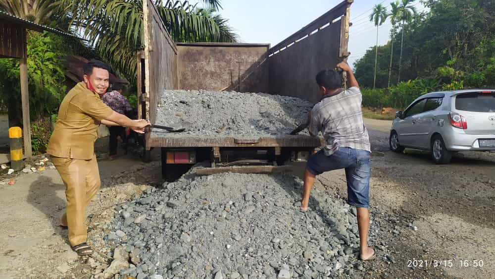 Kepala Desa Aliantan M. Rois Zakaria SE bersama warga dan perusahaan melakukan gotong royong menimbun jalan yang berlobang tersebut .