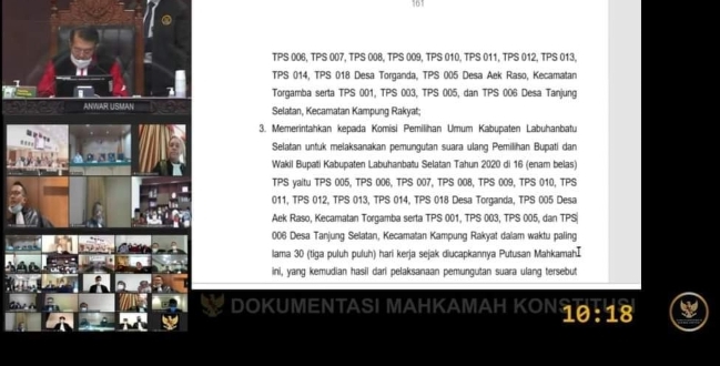 Jakarta ( sumut24.net ) - Berdasarkan hasil sidang Mahkama Konstitusi (MK) melalui aplikasi Youtube, Senin (22/3/2021) Sekira pukul 10.00 WIB, Majelis Hakim menyimpulkan 16 TPS di Kabupaten Labusel dinyatakan Pemilihan Suara Ulang (PSU).