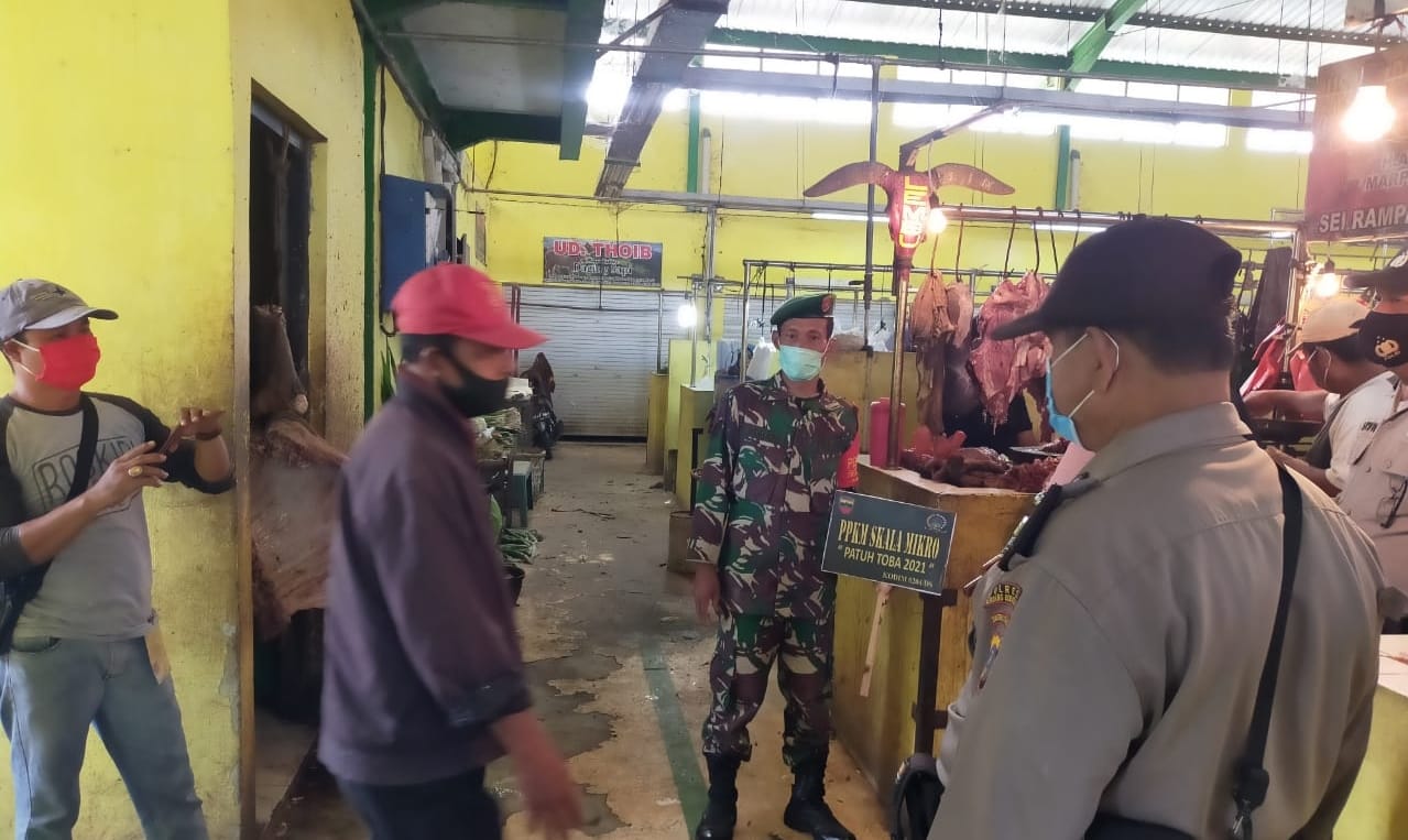 SERGAI ( sumut24.net ) - Banbinsa Koramil 10/Sei Rampah Serma Suhairi dan Koptu Ade. S bersama Babinkamtibmas dan Aparat Desa Sei Rampah melaksanakan kegiatan penanganan covid-19 dan PPKM skala Mikro di tempat keramaian pusat perbelanjaan pajak baru Sei Rampah Kecamatan Sei Rampah, Kabupaten Serdang Bedagai, Jumat (26/3).
