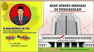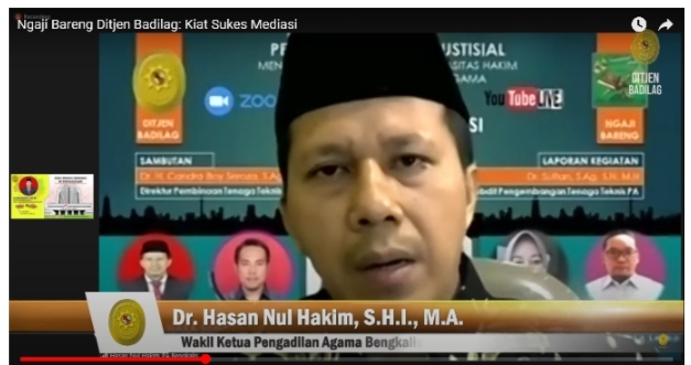 Bengkalis ( sumut24.net ) - Wakil Ketua Pengadilan Agama Bengkalis Dr. Hasan Nul Hakim, S.H.I., M.A didapuk menjadi narasumber Bimbingan Tekhnis Yustisial dengan thema ; Kiat Sukses Mediasi di Pengadilan. Kegiatan ini diselenggarakan Direktoral Jenderal Badan Peradilan Agama Mahkamah Agung RI melalui virtual Zoom pada hari Sabtu (12/06/2021) pukul 05.30 WIB sampai dengan pukul 09.00 WIB, dan disiarkan secara livestreaming di Canel Youtube Badilag , sabtu (12/6/21).