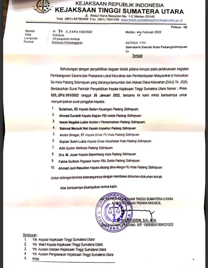 Medan ( sumut24.net ) - 10 pejabat pemko padang sidempuan di panggil kejatisu , kamis (17/02/22) .