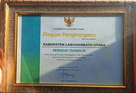Labura ( sumut24.net ) - Pemerintah Kabupaten Labuhanbatu Utara berhasil menerima piagam penghargaan juara III pemenang kinerja pencegahan dan penurunan stunting terintegrasi tahun 2021 se Sumatera Utara, Rabu (30/3/2022).
