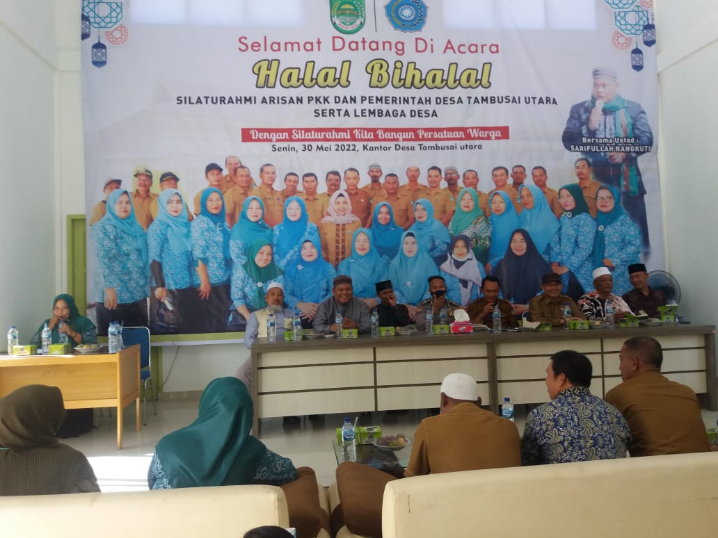 Rohul ( sumut24.net ) - Halal Bil Halal Pemdes Tambusai Utara dan Silaturahmi Arisan PKK dan Pemerintahan Desa Tambusai Utara serta lembaga Desa dengan tema ," Dengan Tali Silaturahmi Kita Bangun Persatuan Warga .
