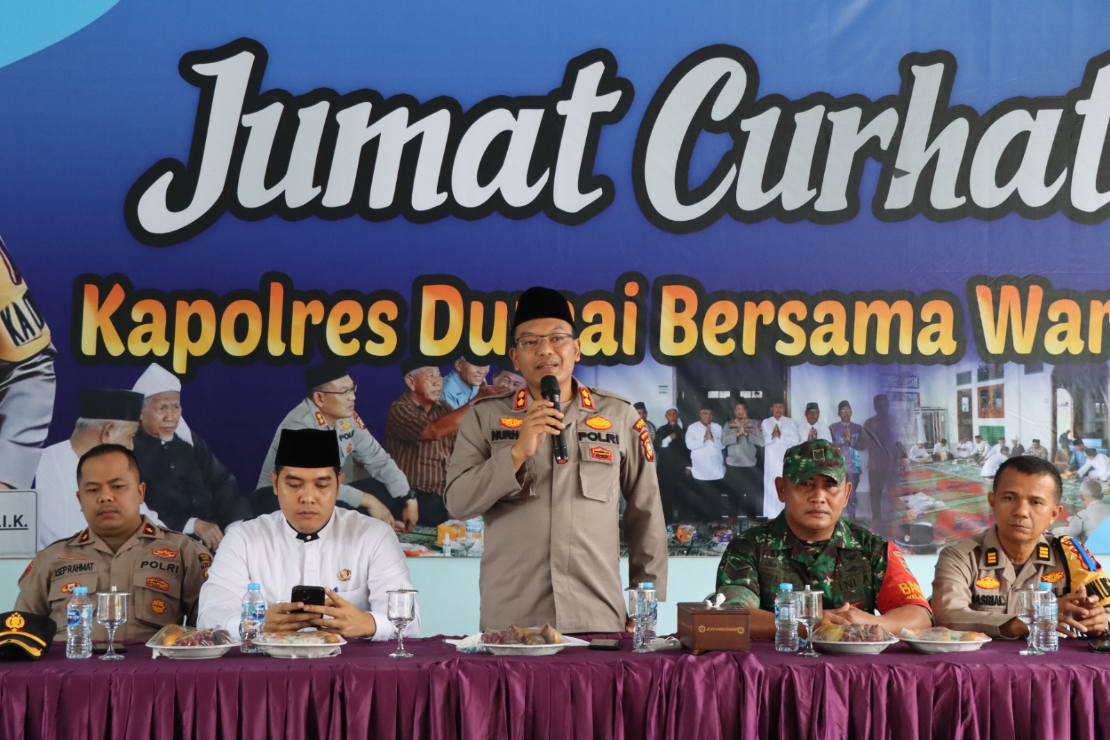 “Melalui program Jum'at Curhat diharapkan mampu menciptakan dan menjaga kondusifitas wilayah Kota Dumai, dan kita dengarkan keluhan-keluhan serta masukan dari masyarakat khususnya untuk kemajuan Kota Dumai maupun kemajuan institusi Polri baik dibidang pelayanan kepada masyarakat, sebagai pelindung, pengayom dan pelayan masyarakat,” harap Kapolres Dumai AKBP Nurhadi Ismanto, S.H, S.I.K.