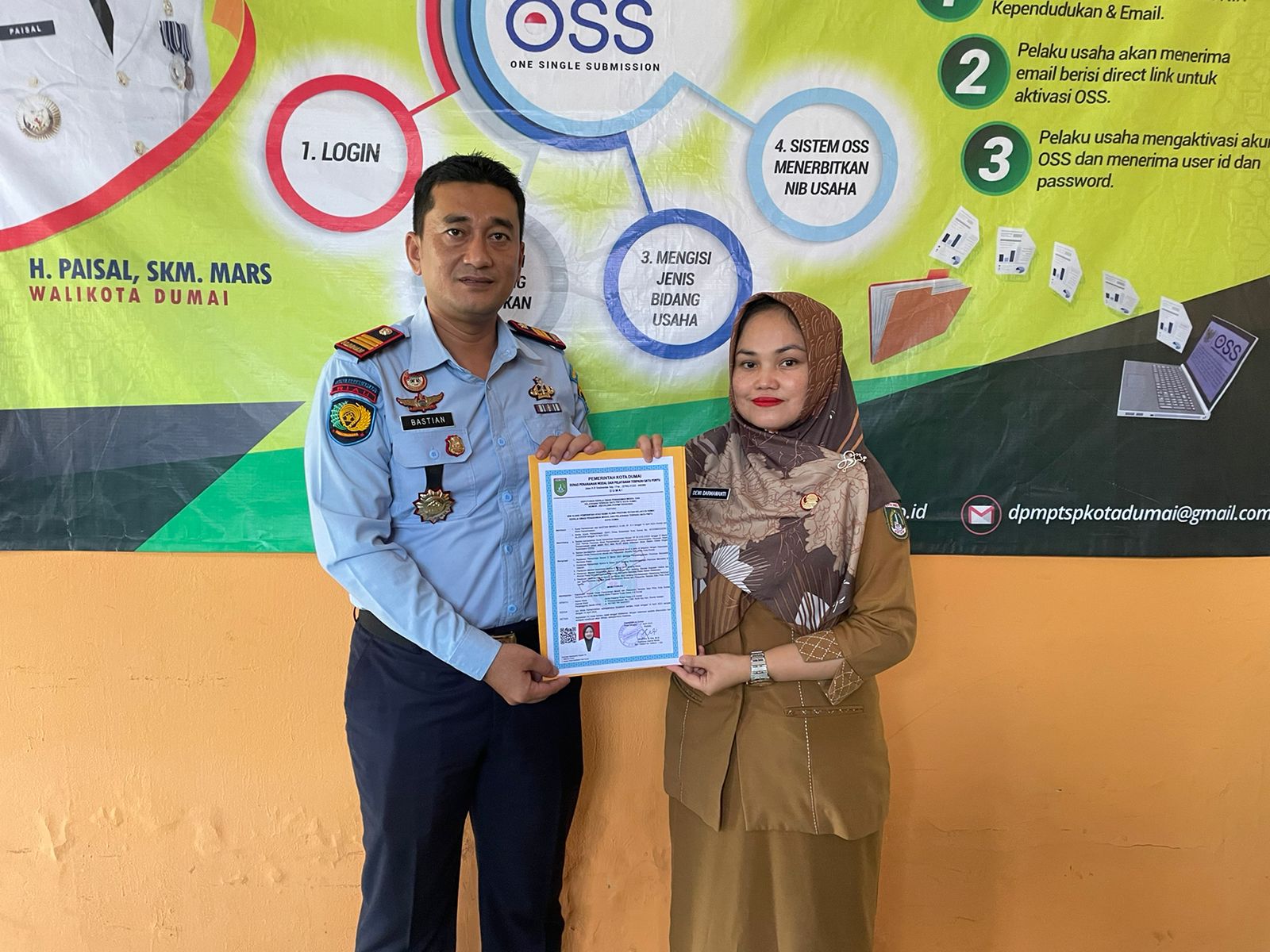 Bertempat di Kantor Dinas Penanaman Modal PTSP Kota Dumai, Kepala Rumah Tahanan Negara Kelas IIB Dumai Bastian Manalu didampingi Kasubsi Pelayanan Tahanan Agung Maulana dan perawat menerima penyerahan izin klinik langsung dari Dinas Penanaman Modal PTSP Kota Dumai.