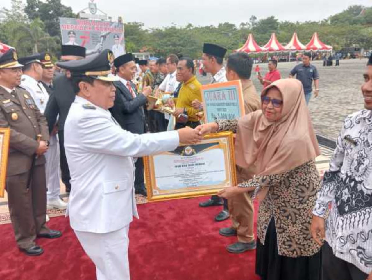 Atas prestasinya tersebut, pasca Upacara peringatan HUT Kemerdekaan RI ke 78 Tahun 2023, di Kantor Bupati Rohul, Kamis (17/8/3023), Helmiwati SPd mendapat anugerah penghargaan dari Bupati H Sukiman.