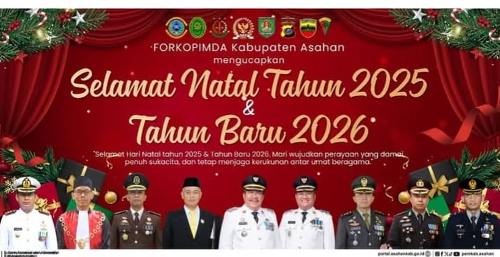 Asahan ( sumut24.net ) - Dalam rangka perayaan Hari Raya Natal Tahun 2025 dan menyambut Tahun Baru 2026, Forum Koordinasi Pimpinan Daerah (Forkopimda) Kabupaten Asahan menyampaikan ucapan selamat kepada seluruh masyarakat Kabupaten Asahan yang merayakan.